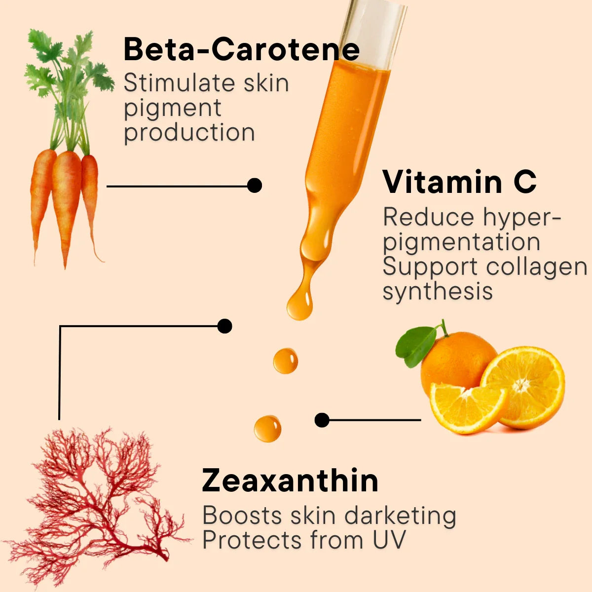 BronzeDrops work by providing the body with a naturally-occuring pigments, Beta-carotene (orange), Lycopene (red) and Astaxanthin (red) in combination with Vitamin C to darken the skin's melanin. By adding a consistent, extract of these daily, these natural pigments contribute to the color-balance and a toning glow of a darker skin complexion.